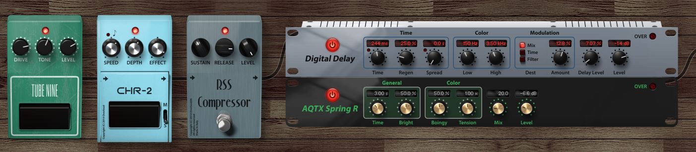 For the audio, I’m using my Silvertone 1449 into a DAW using the Overloud TH3 plugin. Tubescreamer, then boss-style Chorus into a compressor plus delay & reverb. Amp is AC-30-style with Fender Twin 2×12 cabinet.