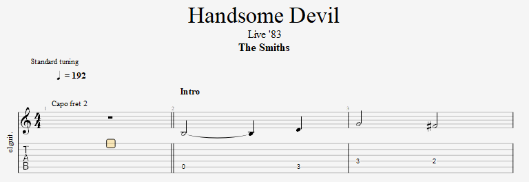 I’ve transcribed based upon the way that Marr played this song in 1983/84. You can see an example from the Rockpalast TV show. You might notice in videos from this period that he doesnt use a capo – thats because he usually tuned his guitars up a whole tone.