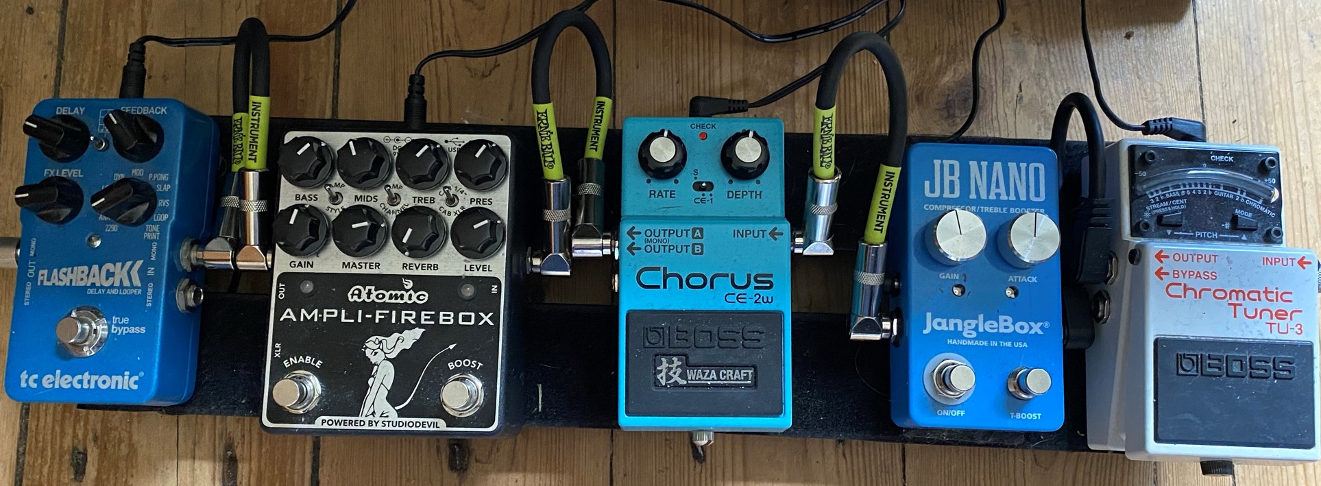 For the audio, it’s my Rickenbacker 330 into this pedal board and then out into my BOSS GT-001 where I add some hall reverb, then into the DAW