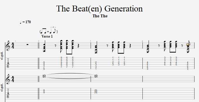 Click the image below to view the tab on Ultimate Guitar. It includes, drums, bass, rhythm and lead parts.